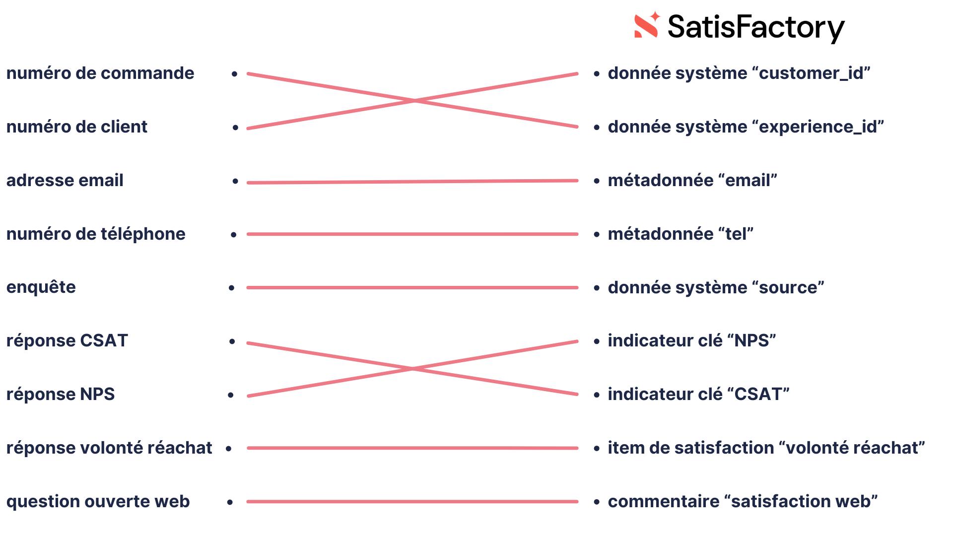 Reliez ensuite ces informations aux différents éléments prévus dans votre dispositif de feedback management : métadonnées, indicateurs clés, attributs/items de satisfaction et commentaires.