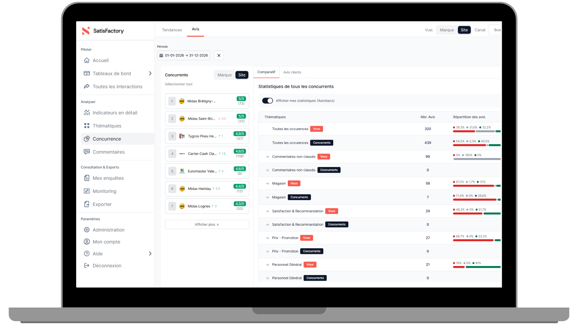 - Vision opérationnelle claire : accédez instantanément à un ranking concurrentiel détaillé par marque ou par établissement pour identifier vos forces et vos axes d'amélioration face à vos 9 principaux concurrents