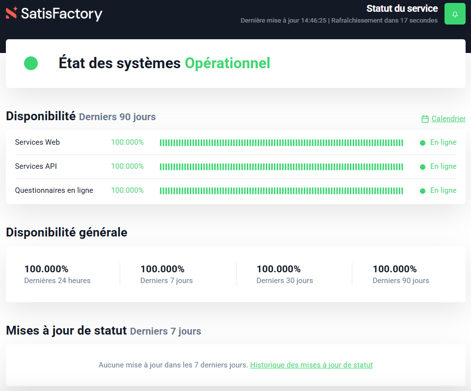 En cliquant sur le bouton "Statut plateforme", vous accéderez à l'espace indiquant en temps réel l’état et la disponibilité des systèmes de la plateforme SatisFactory.