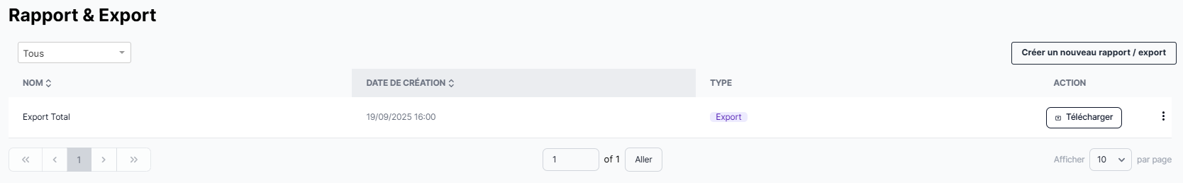 Depuis cette page, consultez et retrouvez facilement tous les rapports et exports déjà créés sur votre compte. La liste vous indique pour chaque élément, son nom, son type (rapport ou export) et sa date de création.