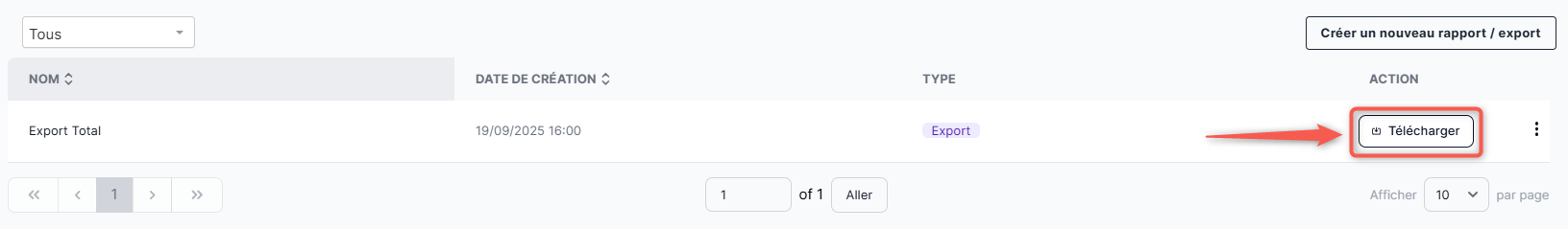 Pour exporter un rapport ou un export que vous avez préalablement sauvegardé, cliquez sur le bouton "Télécharger" disponible dans la colonne "Action" de l'élément dédié.