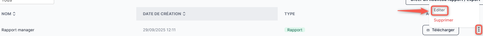Pour modifier ou réutiliser un rapport/export que vous avez préalablement sauvegardé, placez-vous sur un rapport ou export déjà créé, cliquez sur l'icône représentant une ellipse verticale (⋮) puis cliquez sur "Editer".
