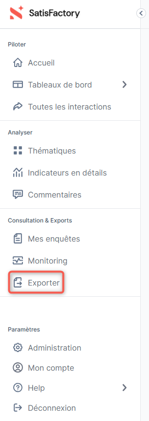 Vous pouvez accéder aux rapports et exports depuis le menu latéral gauche via l'onglet "Exporter".