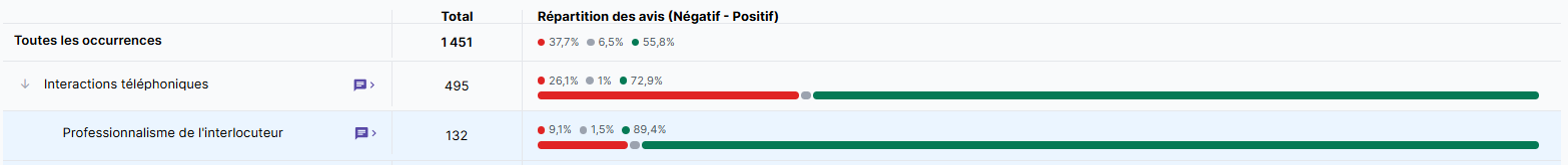 - Ensuite, en complément de votre plan de classement sémantique et du référencement global de la tonalité du commentaire, chaque sous-thématique identifiée dans le commentaire se voit attribuer une tonalité spécifique (positive, négative ou neutre).