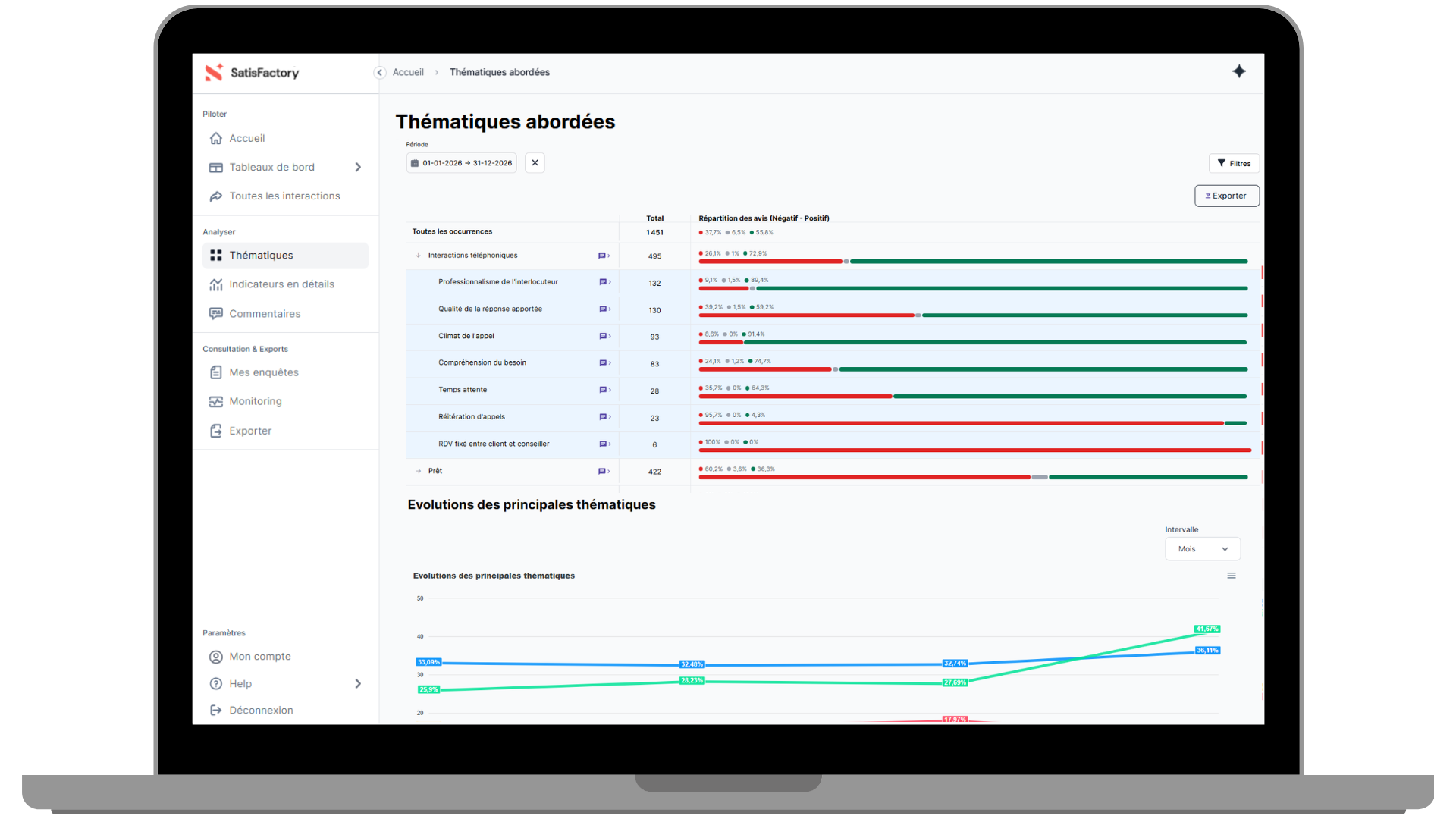 Quelques heures après l'activation du modèle sémantique sur la plateforme, vous retrouverez l'analyse sémantique depuis l'onglet "Thématiques". Cette analyse avancée et personnalisée à votre contexte propre s’intègre également de façon transversale dans de nombreuses autres fonctionnalités de SatisFactory, afin d'enrichir vos analyses et faciliter la prise de décision.
