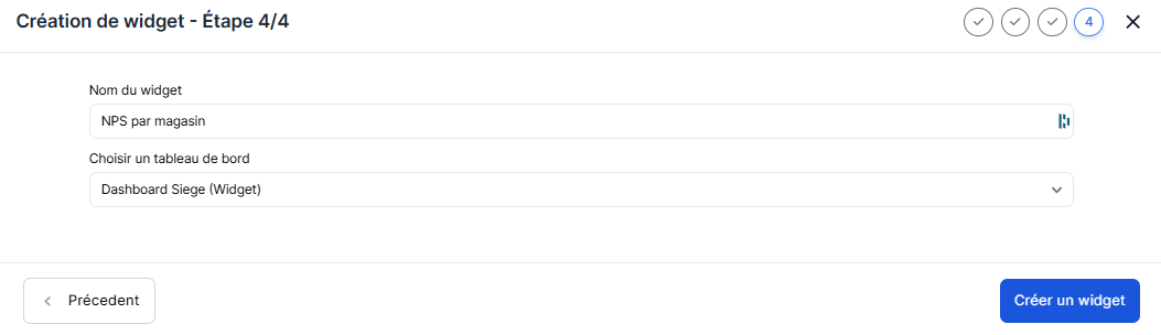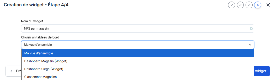 Enfin, en appuyant sur le bouton "Créer un widget", celui-ci sera automatiquement créé et placé dans le tableau de bord choisi, occupant un espace disponible ou se positionnant en dernière position.