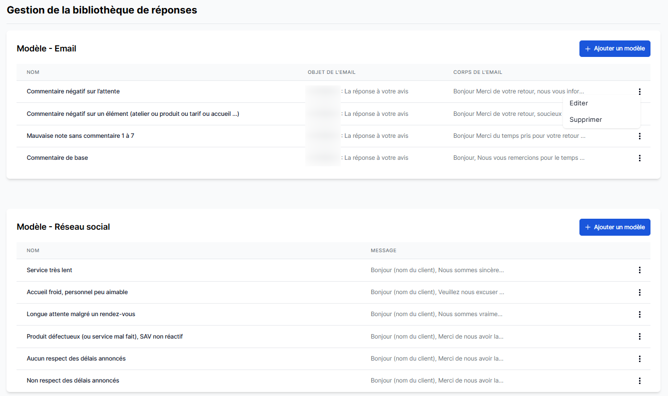 Pour supprimer un modèle de réponse déjà existant, il vous suffit de vous positionner sur le modèle dans votre bibliothèque de réponses, de cliquer sur l'icône représentant une ellipse verticale (⋮) puis de cliquer sur "Supprimer".