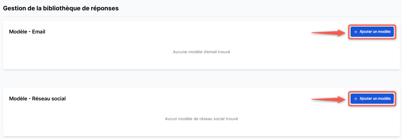Pour ajouter un nouveau modèle de réponse à votre bibliothèque, commencez par vous positionner sur le type de modèle souhaité (email ou réseau social).