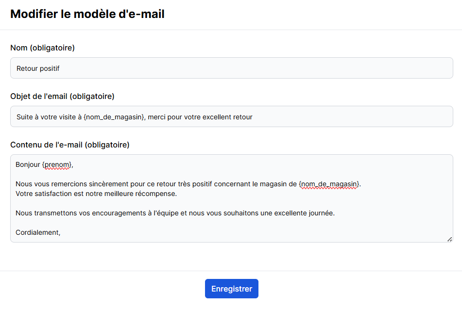 Vous pouvez ensuite apporter toutes les modifications désirées à votre modèle. Assurez-vous de cliquer sur le bouton "Enregistrer" afin d’appliquer l’ensemble des modifications au modèle de réponse.