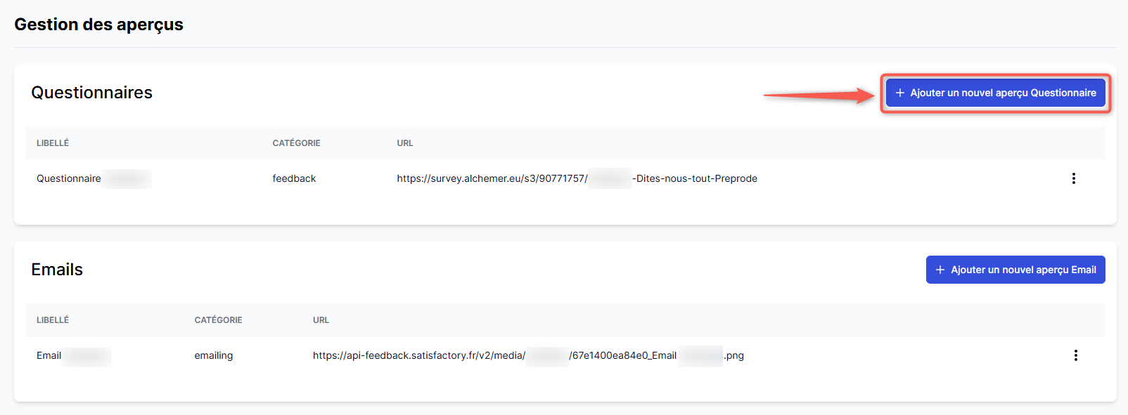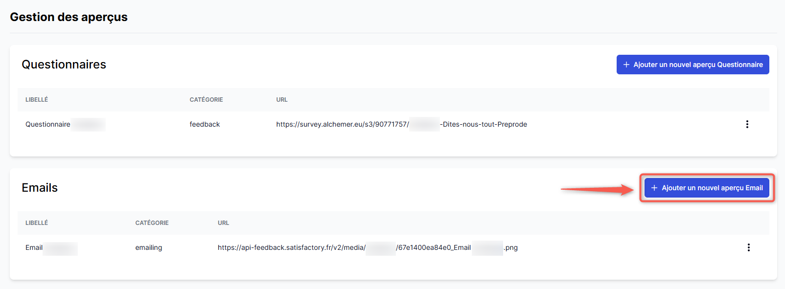 Depuis le centre d'administration de la plateforme, vous pouvez ajouter, modifier et supprimer les prévisualisations de questionnaires et d'emails de votre programme.