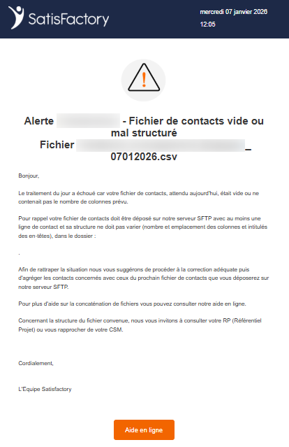 - L'alerte en cas de fichier de contacts vide ou mal structuré déposé sur le SFTP - flux entrant