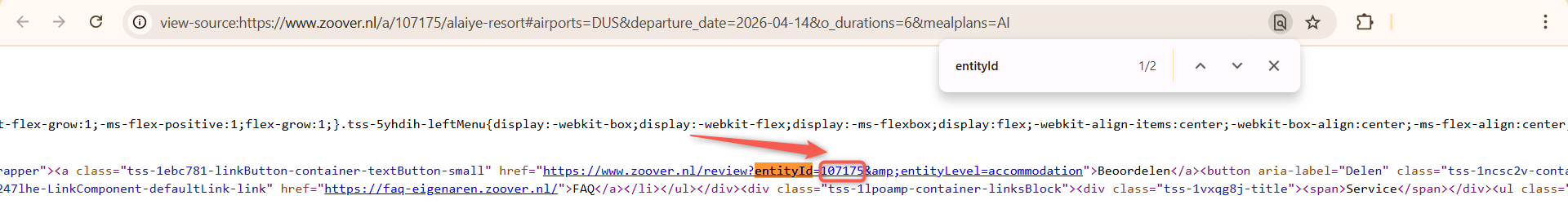 Une fois le code source ouvert dans un nouvel onglet, utilisez la fonction de recherche (Ctrl + F) et saisissez le terme "entityId".
