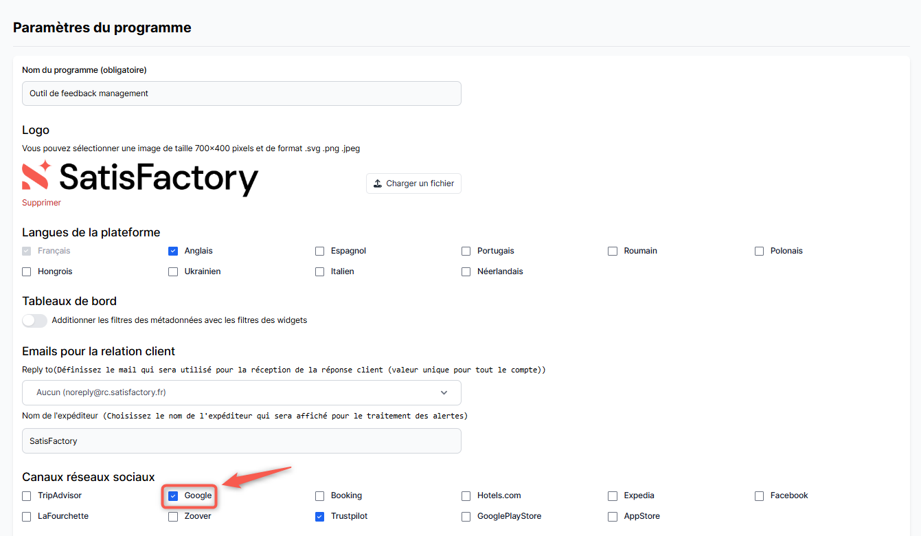 Une fois dans les paramètres du programme, cochez l'option "Google" dans le champ "Canaux réseaux sociaux" pour permettre la collecte des avis sans interfaçage API (et donc sans réponse)..