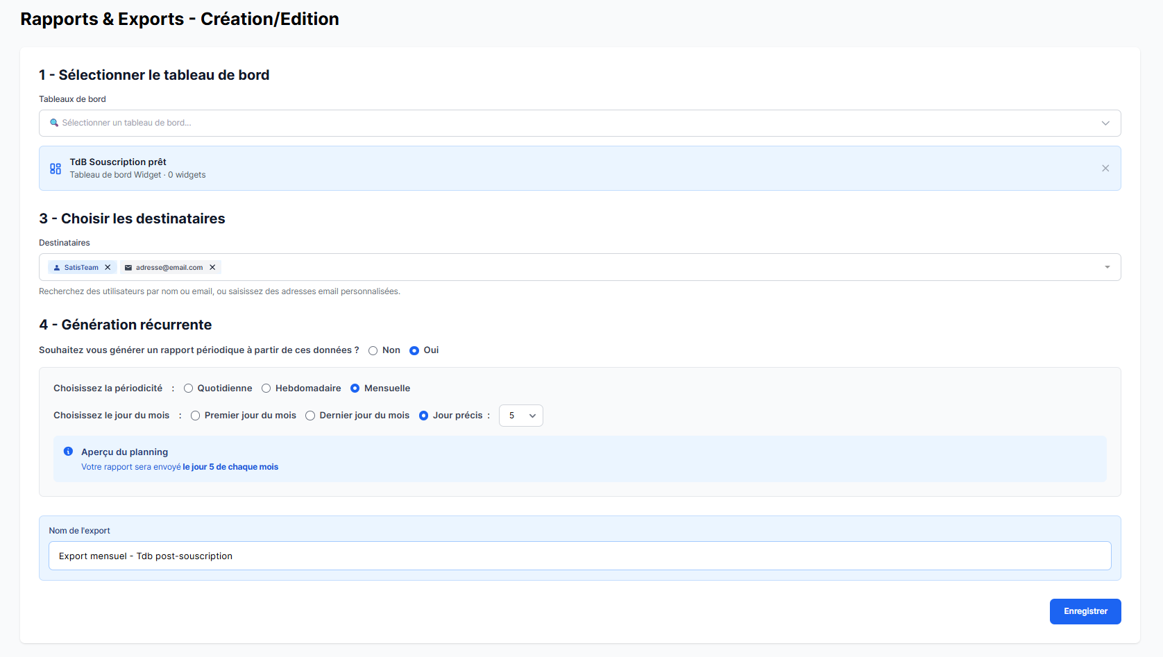 Qu'il s'agisse d'un partage ponctuel à la suite d'une enquête spécifique, ou d'une diffusion récurrente (quotidienne, hebdomadaire, mensuelle) pour automatiser vos reportings réguliers, cette fonctionnalité vous garantit une communication fluide de vos résultats, sans effort manuel supplémentaire.