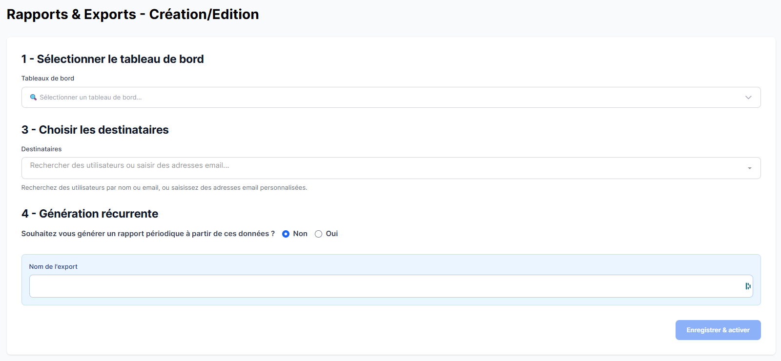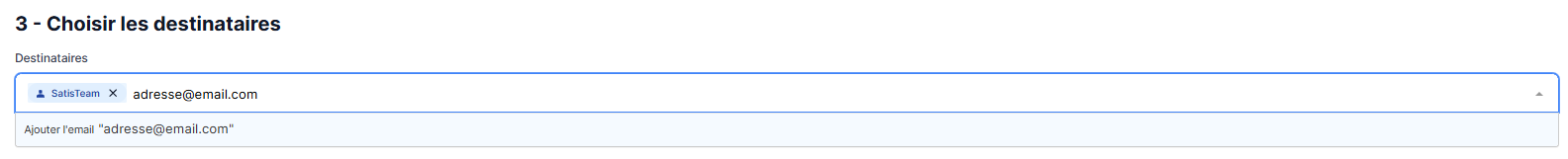Dans la section "2- Choisir les destinataires", définissez les personnes qui recevront le tableau de bord par email. Deux options s'offrent à vous :