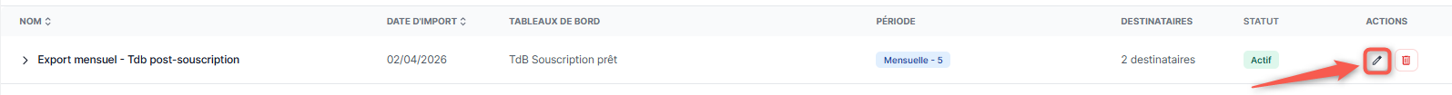 Pour modifier un partage de tableau de bord déjà existant, il vous suffit de vous positionner sur le partage de tableau de bord dans la rubrique "Tableaux de bord" de l'onglet "Exporter", puis de cliquer sur l'icône "Éditer" représentant un crayon.