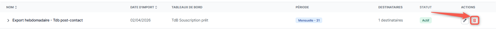 Pour supprimer un partage de tableau de bord déjà existant, il vous suffit de vous positionner sur le partage de tableau de bord dans la rubrique "Tableaux de bord" de l'onglet "Exporter", puis de cliquer sur l'icône "Supprimer" représentant une corbeille.