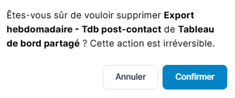 Une boîte de dialogue s'ouvre alors, vous demandant de confirmer la suppression du partage de tableau de bord. Cliquez sur le bouton "Confirmer". Un message de confirmation s'affichera alors automatiquement dans le coin supérieur droit de l'écran, vous confirmant que le partage de tableau de bord a été correctement supprimé.