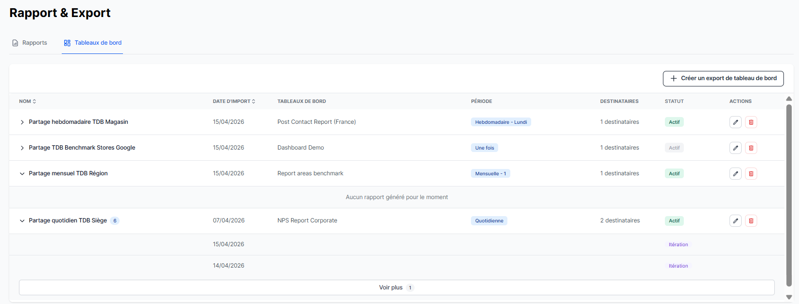 Tout comme le reste de l'onglet "Exporter", cet espace de gestion est strictement personnel. Les partages configurés ici s'appuient exclusivement sur votre propre périmètre d'analyse et ne sont visibles que par vous.