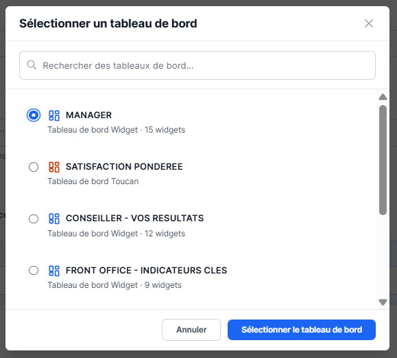 Dans la section "1- Sélectionner le tableau de bord", choisissez le tableau de bord que vous souhaitez partager et cliquez sur le bouton "Sélectionner le tableau de bord".