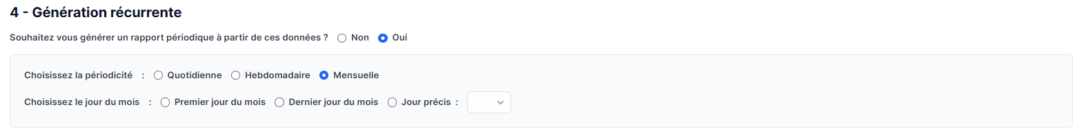 Dans la section "3- Génération récurrente", vous pouvez programmer la récurrence du partage selon une fréquence régulière. Pour cela, il vous suffit de cocher "Oui", puis de choisir la périodicité souhaitée. La génération se fera à la période définie, à six heures du matin.