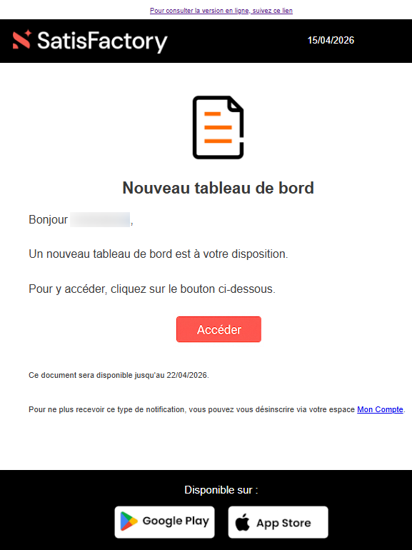 Si vous êtes l'un des destinataires d'un partage de tableau de bord par email, vous recevrez à la récurrence définie un email envoyé par l'adresse satisfactory@email-booster.satisfactory.fr dont le sujet sera "[Nom du programme] - Nouveau tableau de bord disponible".
