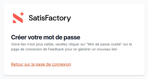Si l'email est toujours introuvable, patientez quelques minutes et contactez votre équipe IT/SI pour vérifier que l'email n'est pas bloqué par votre serveur d'entreprise. Dans le cas où cette situation ne s'applique pas, contactez le Support SatisFactory en précisant l'adresse email renseignée et les démarches effectuées.