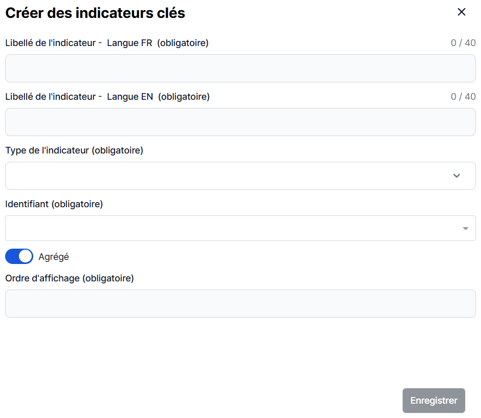 Un nouveau volet de configuration s’ouvre sur la droite, vous permettant de renseigner les informations nécessaires à la création d'un indicateur agrégé.